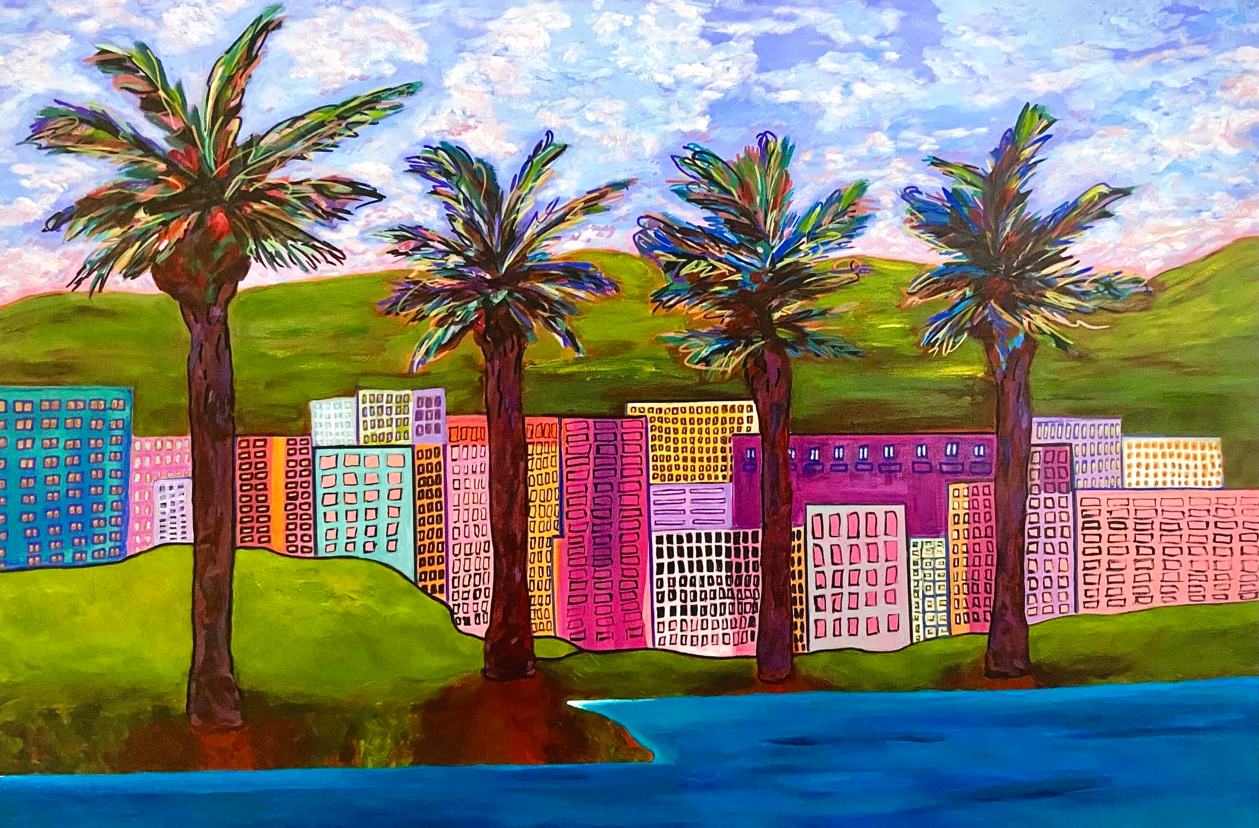 Tracey’s art is a visual diary of places she has lived or visited on vacation. Her artistic style is modern expressionism. Her work is characterized by distorted forms, bold colors, and dramatic, thick brushstrokes to convey intense feelings, such as anxiety or raw emotion.